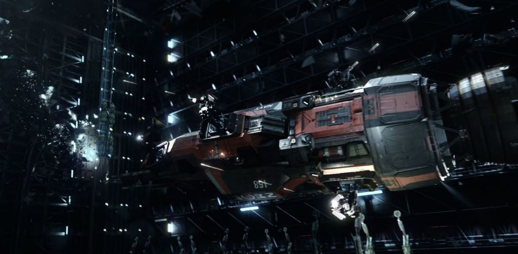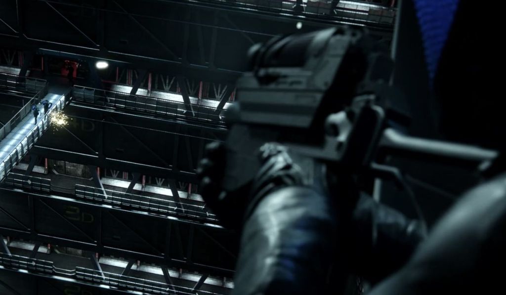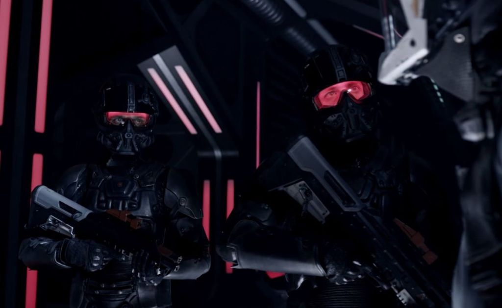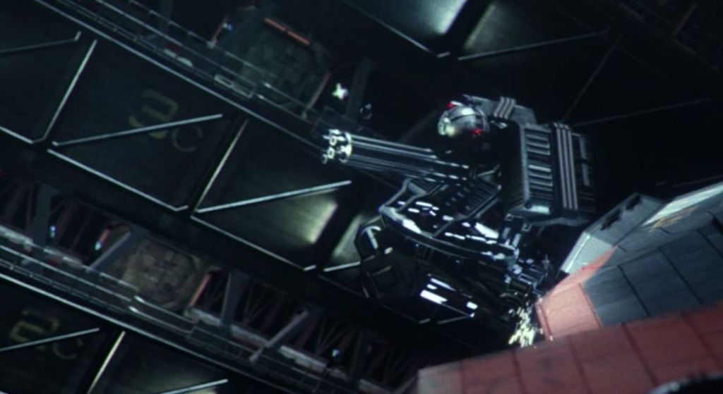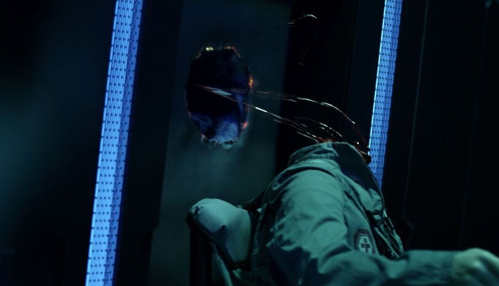 A brief shot of one of the attackers firing at our escaping heroes. Their weapon is apparently also a highly modified airsoft gun, itself a replica of the Magpul FMG-9. Note the ship on the right, which our first good look at the MCRN Tachi, the future Rocinante – and in my view, one of the most important characters in the series (more on her in the next episode recap!)
