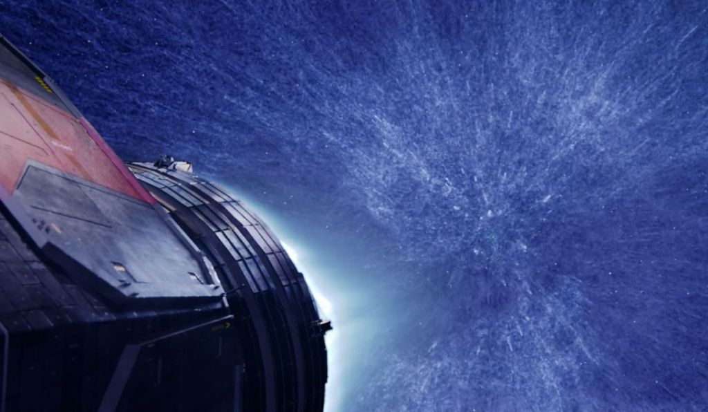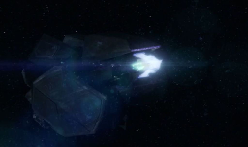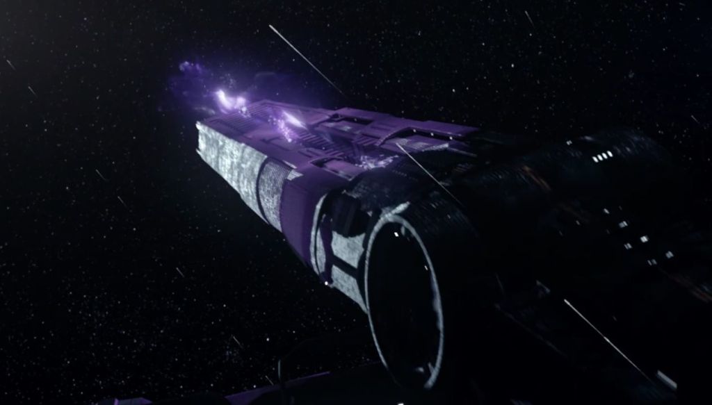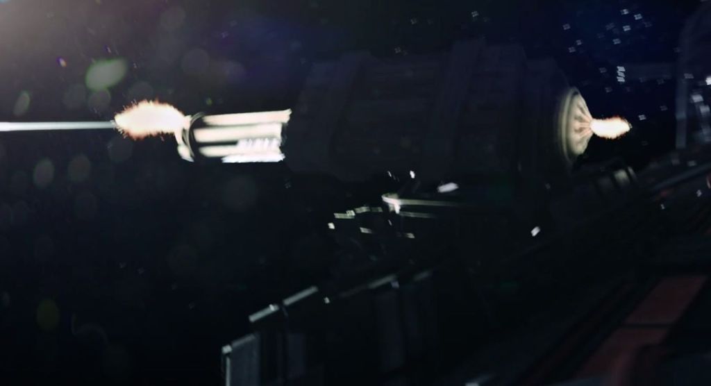 Below you see the MCRN Tachi/Rocinante with all guns blazing – again, despite the ship being untethered, firing all the guns simultaneously in sweeping firing arcs does not appear to push it around, supporting the impression that these are indeed recoilless designs.