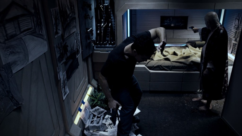 The first weapon we see used the show is a bit of an oddity. As we join James Holden into the quarters of the ice hauler Canterbury´s rather distraught Executive Officer (who´s name we never learn) we are introduced to a man that clearly has an affinity for both Daisies and (what at that point must be rather vintage) firearms. Some googling tells me that his collection includes a Smith & Wesson Model 10 M&P, a Walther P88, a Colt Anaconda, multiple lever action rifles, and, significantly, a Colt Single Action Army, a gun he uses to blow up the screen in his quarters. I don’t know if it is deliberate, but Holden´s reaction does give us an impression of the kind of percussive shock that would be experienced from firing a large handgun a small room like this, which is perhaps also why this is the last time we see any «classic» firearms used on the show.