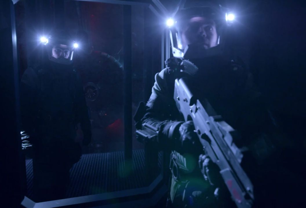 We only see weapons used twice – once when Amos gives us one of the first insights into his violent inclinations – and in the closing scene, with our heroes being boarded and captured by the Martians – seems laser sights are still a thing…!