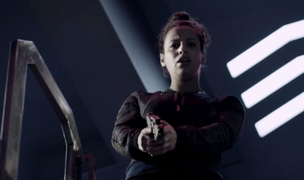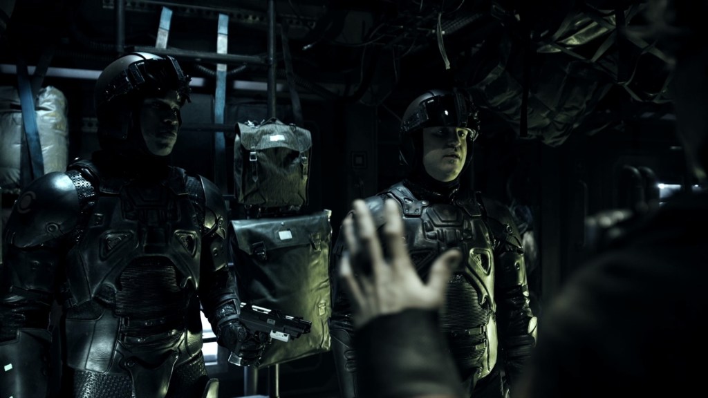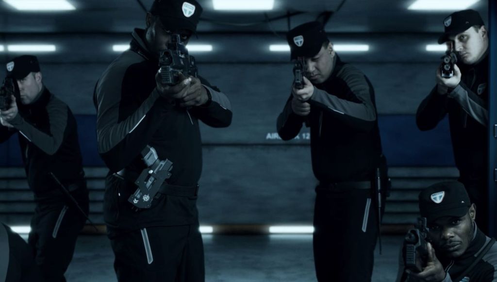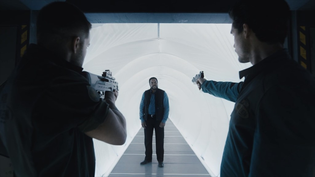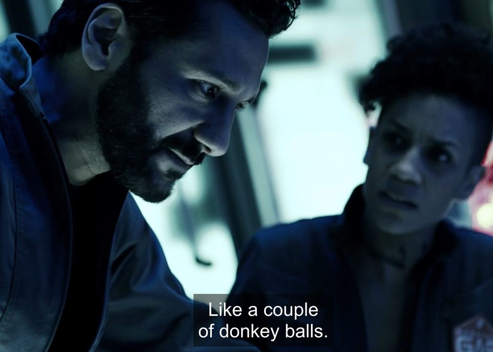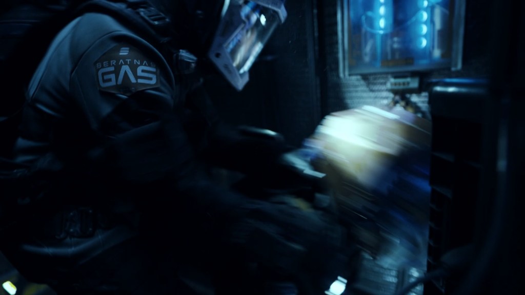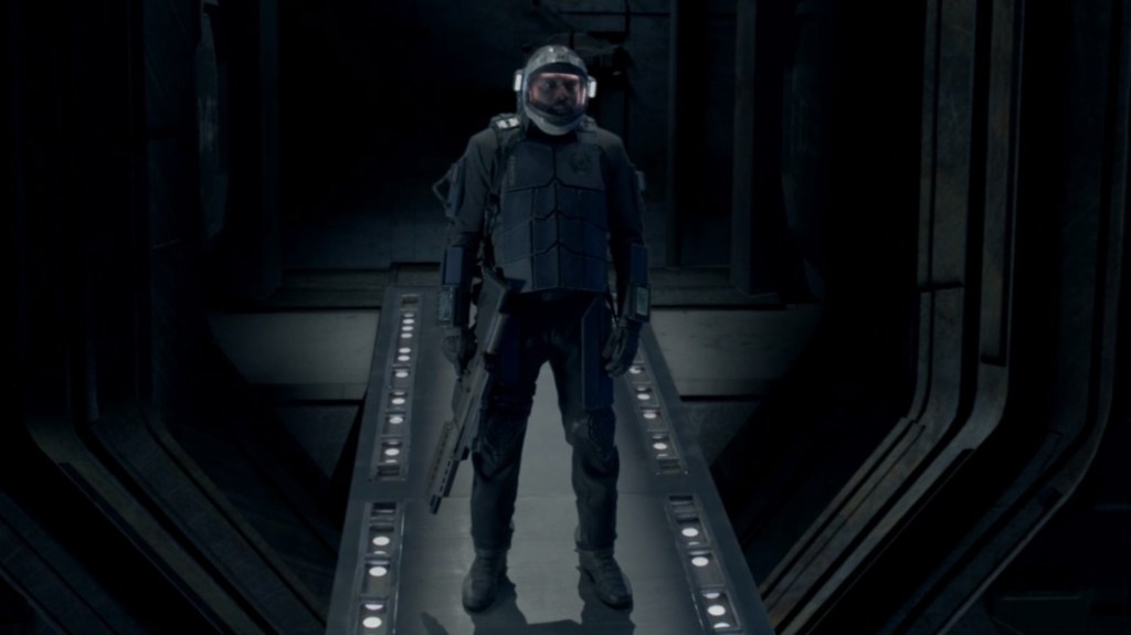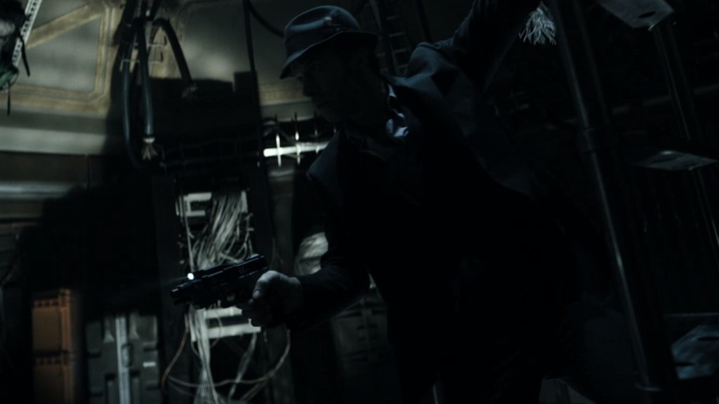 But beyond brooding looks and tense encounters, nothing much happens in the weapons department until Miller begins chasing down some new leads. Climbing down into a ship docked at Ceres, he pulls out his Star Helix standard issue side arm again, and reveals that it has another useful feature – a built-in light. On a side note, I am reading the book in parallel with the rewatch, and there some weapons, particularly handguns, that are specifically mentioned as recoilless, specifically firing «self-propelled rockets» which sounds like a reference to gyrojets or something similar. Given the way Miller handles his weapon, seemingly unconcerned by any recoil, it seems like this could be one of those weapons (though my analysis leads me to think that the guns we see on the show are more likely to be a gauss/coil gun).