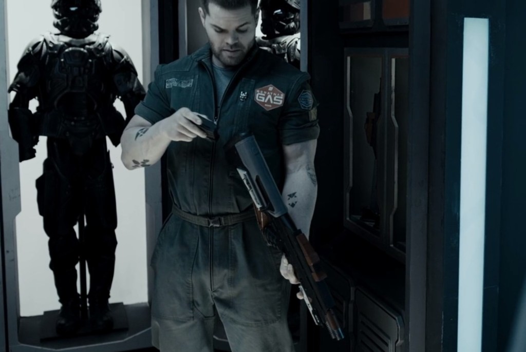 The only real gun action we see is during a tense standoff between Amos and Holden as they are about to be boarded by a Martian patrol. We get our first glimpse at how a Martian assault rifle is loaded, as Amos appear to be entering a magazine into the buttstock (not the most logical place, would have to flip the rifle to reload during combat…!) Alternatively, if the rifle is an electrically powered gauss or coil gun, which uses electricity to power the projectiles, he could be inserting a power pack of some sort, which presumably would have to be replaced less frequently than a magazine. More on that here, in my profile of the Martian Assault Rifle.