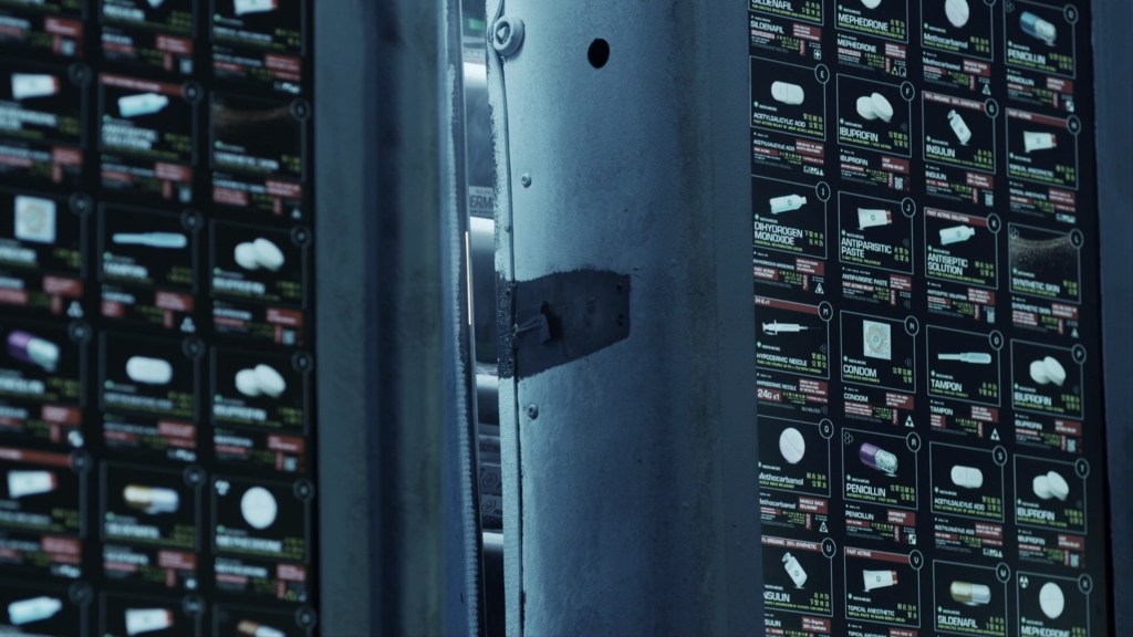 Our heroes survive, of course (barely) and make it to the ship where they are met by Amos. Note the marks on their body armor where rounds have flattened themselves against the plating. With most ammunition in the show clearly designed to be effective against people without risking holes in walls and bulkheads, it apparently becomes possible to stop bullets if you have the right materials (as long as the bullets are nice enough to avoid all the gaps between the tiles in your armor…!)