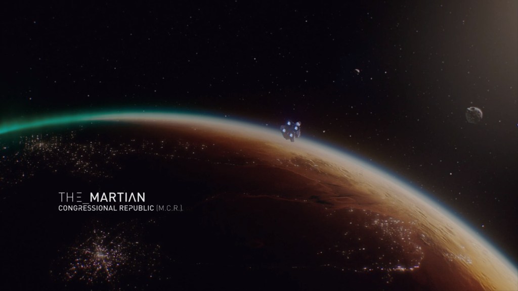 Mars is referenced throughout season 1, and we meet Martians and see Martian naval vessels in action – but we never get to see the planet. This is rectified in the very first shot of the cold open, showing us several major population centers on the surface, the two moons, Phobos and Deimos, and what presumably is a Martian naval vessel (potentially the Scirocco) swooping past.