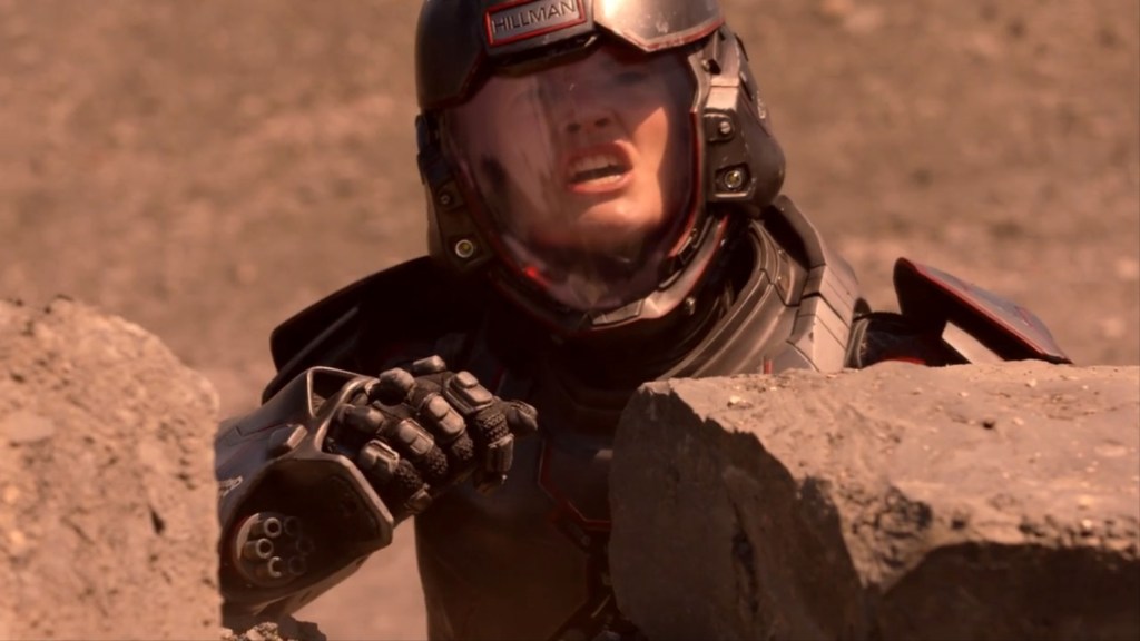 As they gaze upon this wonderful vista (h/t Pres. Bartlet) we get an insight into the apparent egalitarian nature of the Martian military – it would seem Hillman comes from a pretty wealthy family, as they own “all” of the terraforming towers on Mars. Still, she serves as a private in the MMC.