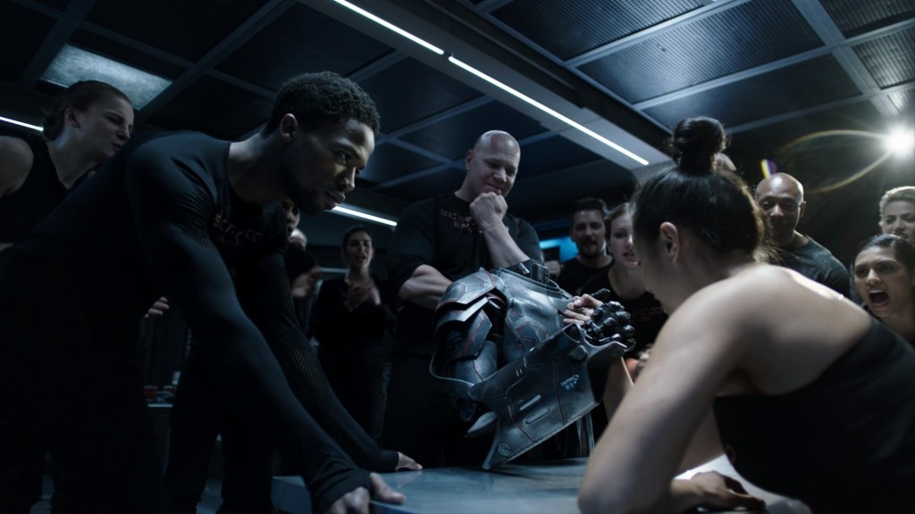 Then we get some more proof of Boddy’s bad-assery, as she arm wrestles the torso of her suit. If nothing else, it tells us that the motors in the suit are only intended as power augmentors, and not to deliver any super human force.