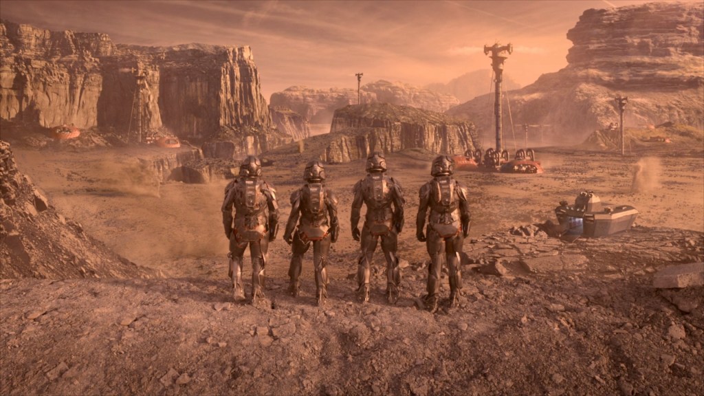 After the Marines are told they are shipping out, to say their good byes and kiss their mommies, we get a good look at their armor, their drop ship and the terraforming towers we saw in the distance earlier.