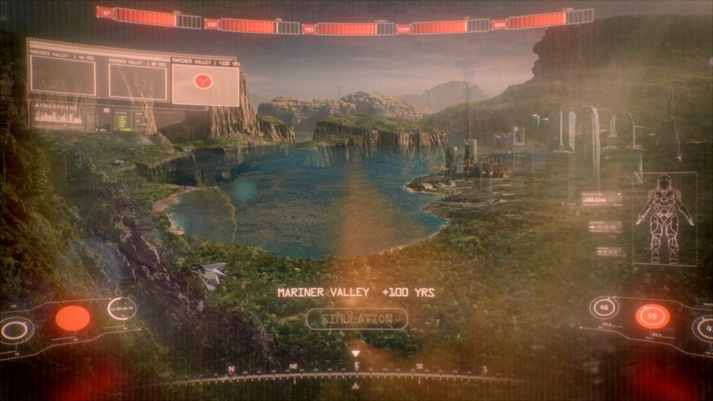 Before the scene ends, in what I assume is an attempt at showing what drives Bobby and the dream of Mars, we first see her picking up a handful of Martian soil, and after watching the dry sand blow out from between her fingers, she brings up a simulated view of the Mariner Valley in 100 years, when terraforming has transformed it into a green oasis, while muttering to herself “some day.”