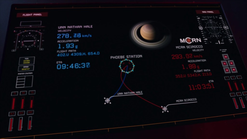 But now we are approaching the climax of the MCRN-arc of the episode – a potential showdown on Phoebe, where Mars knows the Donnager found something, but where Errinwright is desperate to ensure they do not figure out exactly what that was. It begins with a couple of set-up shots, showing us the potential battlefield and who the players are.