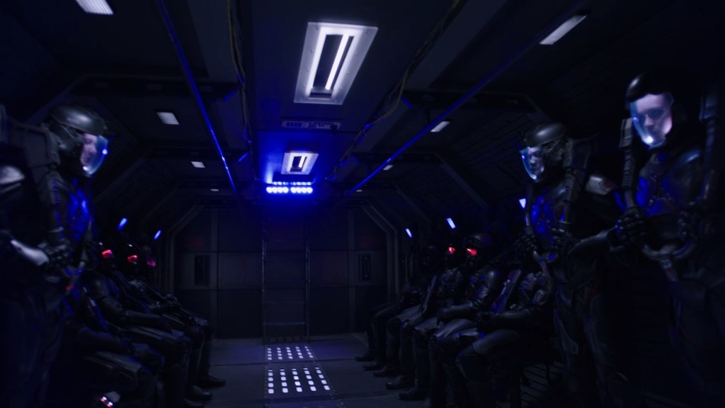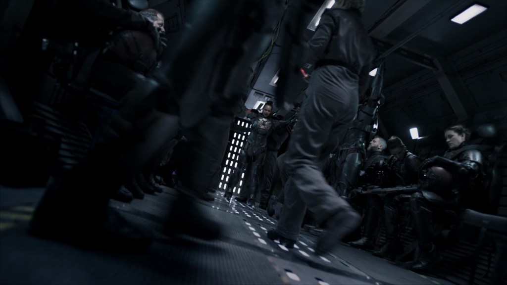 It seems Martian drop ships carry a mix of Marines in power armor and light armor. Note how the Marine on the right in the photo above is carrying the armor we have seen on both the Donnager and the Rocinante, and a standard Martian Assault Rifle, not the lighter ones we saw in the armory scene earlier.