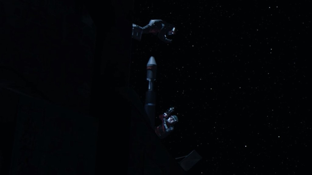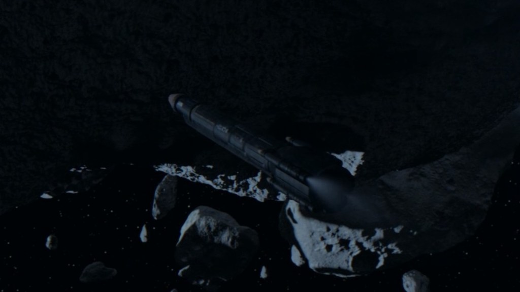 This is followed by a pretty sweet parking job by Alex, as he hides the torpedo next to a small asteroid. Note the thrusters firing at the rear of the torpedo.